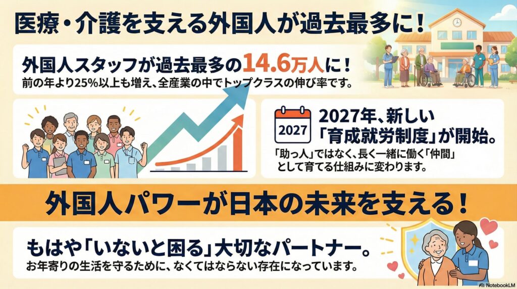 医療・福祉分野での外国人労働者数が増加して2.5万人を超えた。2027年に導入予定の「育成就労制度」を見越した教育・定着支援への投資が急務となる。