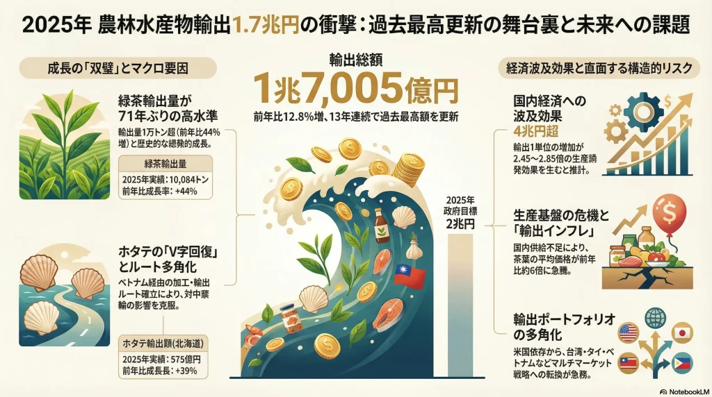 農林水産物の2025年輸出額が1.7兆円となり13年連続で過去最高を更新。特に抹茶ブームを背景とした緑茶やホタテが好調の一方で和牛は苦戦、政府目標の2兆円には届かず。