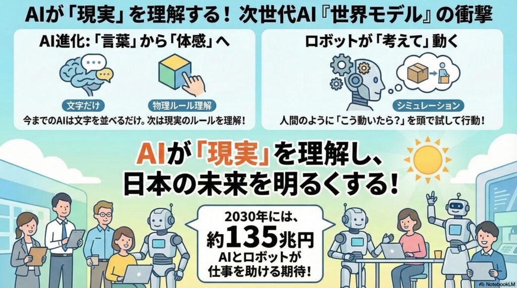AIは従来の言語予測モデルから、現実世界の物理法則や因果関係を模倣する「世界モデル」へと転換していく。世界モデルの実装により、AIの主戦場はデジタル空間のテキスト処理から、物理世界と直接的に相互作用する「フィジカルAI」へ移行する。