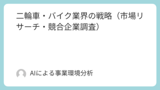 ②自動車・機械 二輪車・バイク業界の戦略(市場リサーチ・競合企業調査) 内燃機関の終焉か、復権か:電動化とAIが拓く二輪車産業の新航路第1章:エグゼクティブサマリー本レポートの目的と調査範囲本レポートは、世界の二輪車業界が直面する歴史的な転換点において、持続的な成長を達成するための事業戦略を策定することを目的と... ②自動車・機械