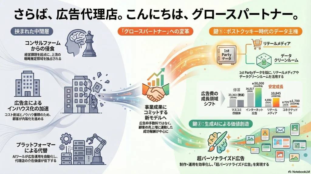 広告枠の販売手数料に依存する収益モデルから脱却し、顧客の事業成果(売上、顧客生涯価値(LTV)向上など)に連動するレベニューシェアや成功報酬型モデルを事業の核に据えるべきである。これを実現するため、マーケティング領域に留まらず、顧客の事業戦略、DX(デジタルトランスフォーメーション)、BX(ビジネス・トランスフォーメーション)全体を支援するコンサルティング能力を獲得する必要がある。 - ポストクッキー時代のデータ基盤を再構築せよ。