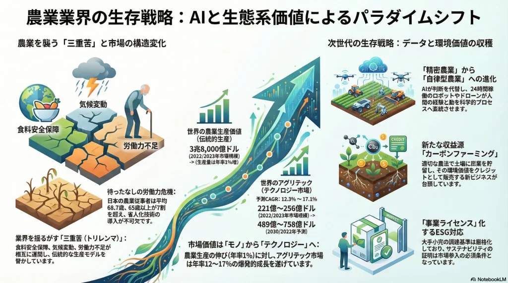 この急成長の背景には、AI、IoT、ロボティクスといった技術革新に加え、本レポートで詳述する食料安全保障、気候変動、労働力不足といった深刻な課題解決への強い要請があります 7。