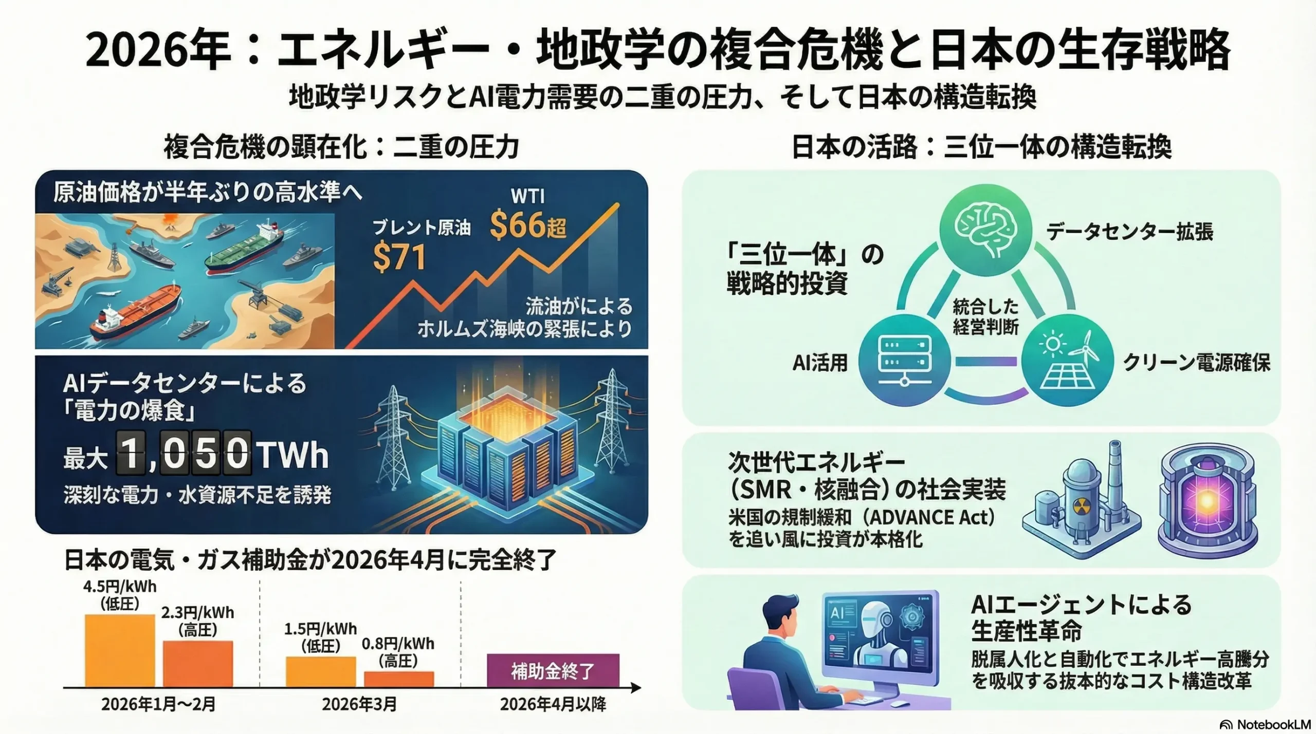 2026年グローバルエネルギー・地政学複合危機:AI電力需要と中東情勢が日本経済に与える構造的影響と戦略的対応