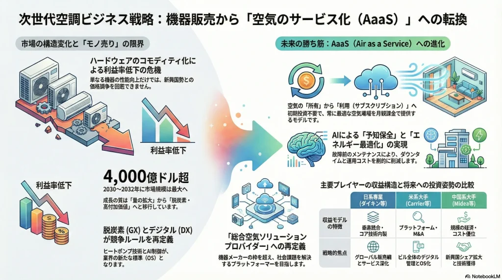 空調業界の競争の主戦場は、高効率なハードウェアの製造・販売から、データを活用してエネルギー効率、健康、快適性といった無形価値を提供する「ソリューション・プラットフォーム」へと不可逆的にシフトしている。この変化は、業界の収益構造と競争優位の源泉を根本から覆すものである。