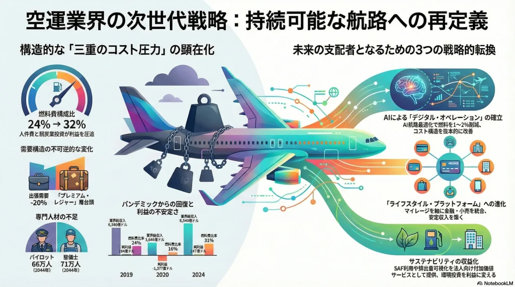 一方で、業界の収益性は、地政学リスクに起因する燃料費の高騰、専門人材の不足に伴う人件費の上昇、そして「フライトシェイム」という言葉に象徴される脱炭素化への巨額投資という「三重のコスト圧力」に恒常的に晒されています。従来の路線拡大やコスト削減努力だけでは、持続的な利益を確保することは極めて困難であり、ビジネスモデルの根本的な変革が不可欠です。