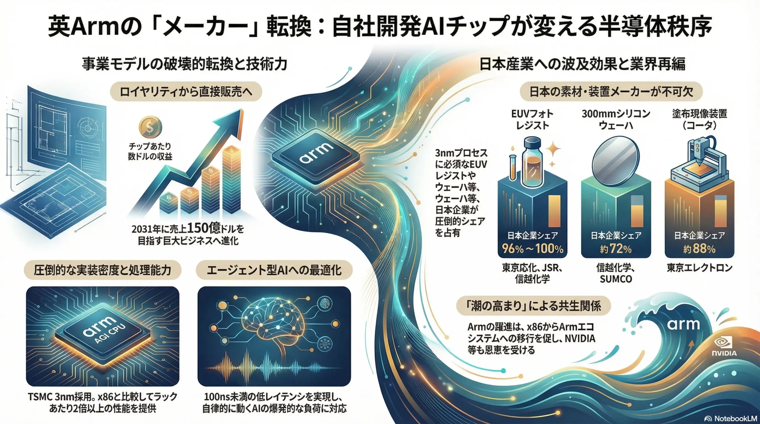 Arm AGI CPUはTSMCの3nmプロセス技術を採用して製造される1。AIチップの高性能化と微細化が進むにつれ、シリコンウェーハやフォトレジスト(感光材)、各種化学薬品に対する品質要求は極限まで高まっており、日本企業はこれらのコア材料分野において代替困難な市場シェアと技術的障壁を築いている21。