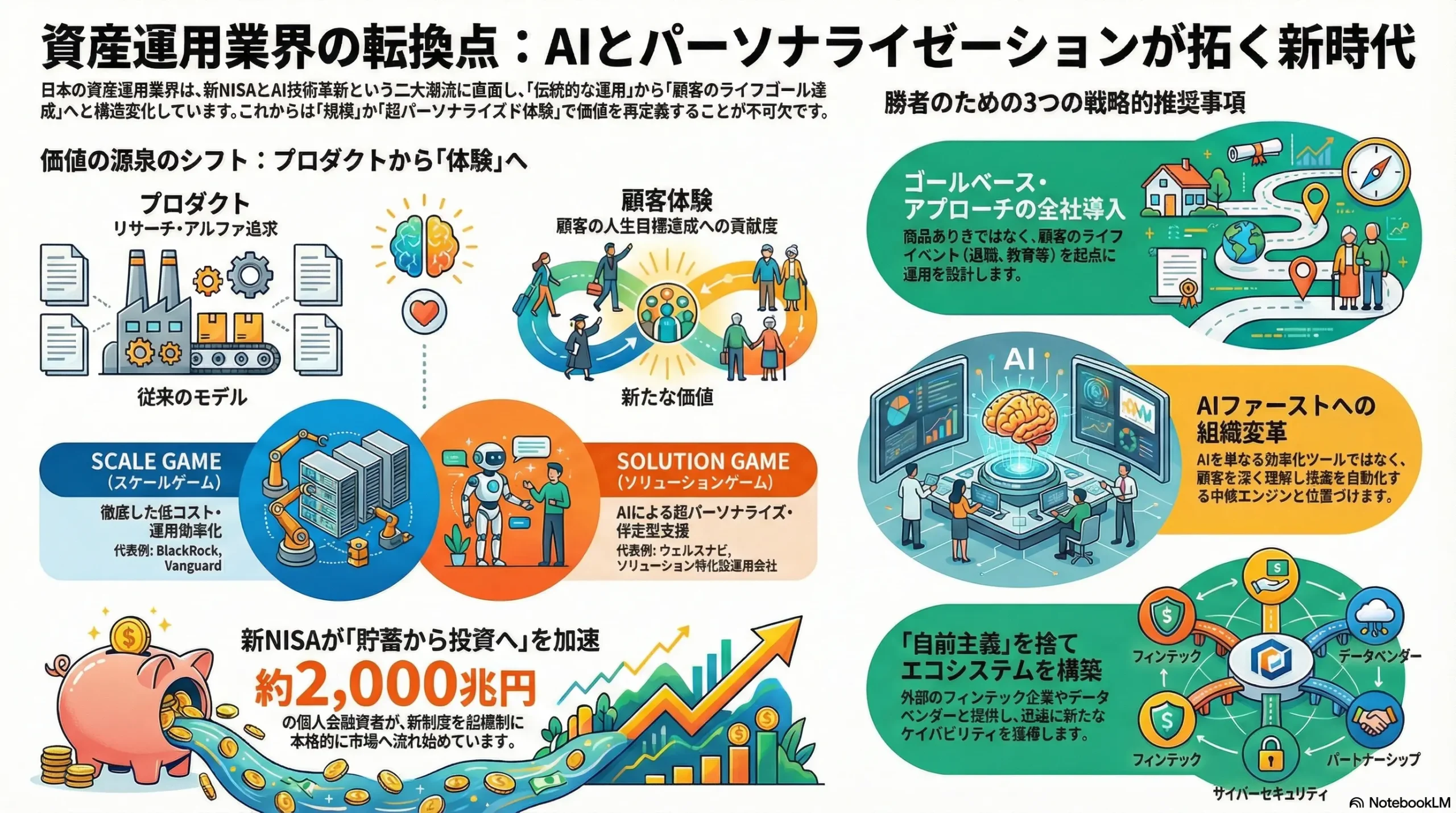 資産運用業界は、手数料ゼロ競争が激化する「規模と効率のゲーム(スケールゲーム)」と、超パーソナライズされたソリューションで高付加価値を追求する「専門性と顧客体験のゲーム(ソリューションゲーム)」へと明確に二極化しつつある。この構造変化の中で、伝統的なプロダクト提供中心のビジネスモデルは急速に陳腐化し、価値の源泉は伝統的な「アルファ(市場平均を上回るリターン)の創出」から、「顧客一人ひとりのライフゴール達成への貢献度」へと不可逆的にシフトしている。この変革を主導する二大エンジンは、AIによるバリューチェーン全体の再構築と、2024年から始まった新NISA制度を起爆剤とする個人投資家層の本格的な市場参入である。この二つの潮流に適応できない企業は、市場が成長する中で収益が減少するという「利益なき繁忙」に陥り、淘汰されるリスクが極めて高い。