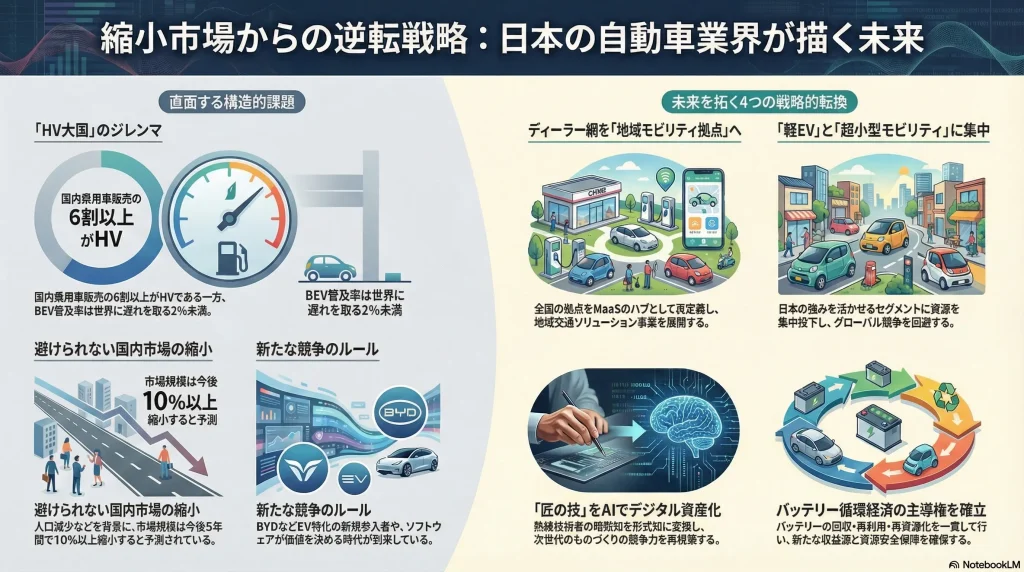 日本の自動車業界は、歴史的な岐路に立たされている。国内市場は、ハイブリッド車(HV)が乗用車販売の6割以上を占める一方、バッテリー式電気自動車(BEV)の普及率は1~2%台に留まり、世界的な電動化の潮流から取り残されつつある 1。この「HVでの成功体験」が、BEVへの大胆な経営資源のシフトを躊躇させる「イノベーションのジレンマ」の根源となっている。同時に、人口減少は国内新車市場の構造的な縮小を不可避なものにしている 3。