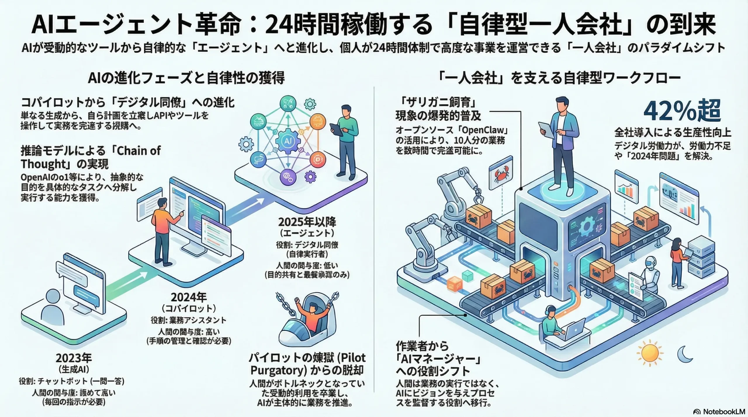 2020年代前半における人工知能技術は、主に大規模言語モデル(LLM)を中心としたテキストや画像の生成に焦点が当てられていた。しかし、2025年から2026年にかけて、エンタープライズ領域における自動化のパラダイムは根本的な転換点を迎えている。それは、人間のプロンプトに対して受動的に応答する「コパイロット(副操縦士)」から、自ら目的を理解し、計画を立案して実行に移す「AIエージェント(Agentic AI)」への進化である 1。