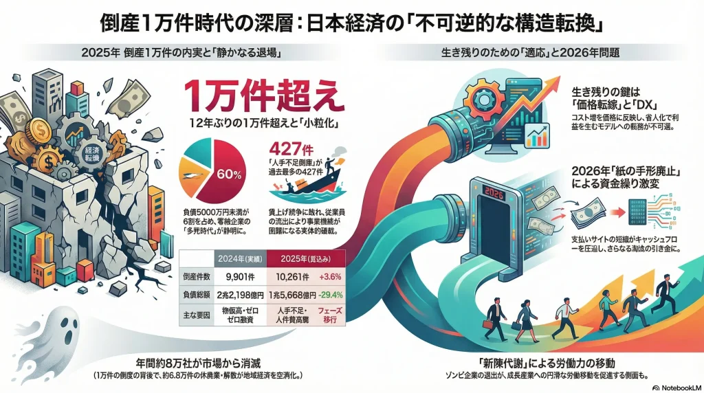 2025年、日本の企業倒産件数は2年連続で1万件の大台を突破し、1万261件(前年比3.6%増)を記録した。この数字は、リーマンショック時のような一過性の金融危機によるものではなく、日本経済が長年先送りにしてきた「人口動態の変化」と「低生産性構造」の清算プロセスが、不可逆的なフェーズに突入したことを示唆している。