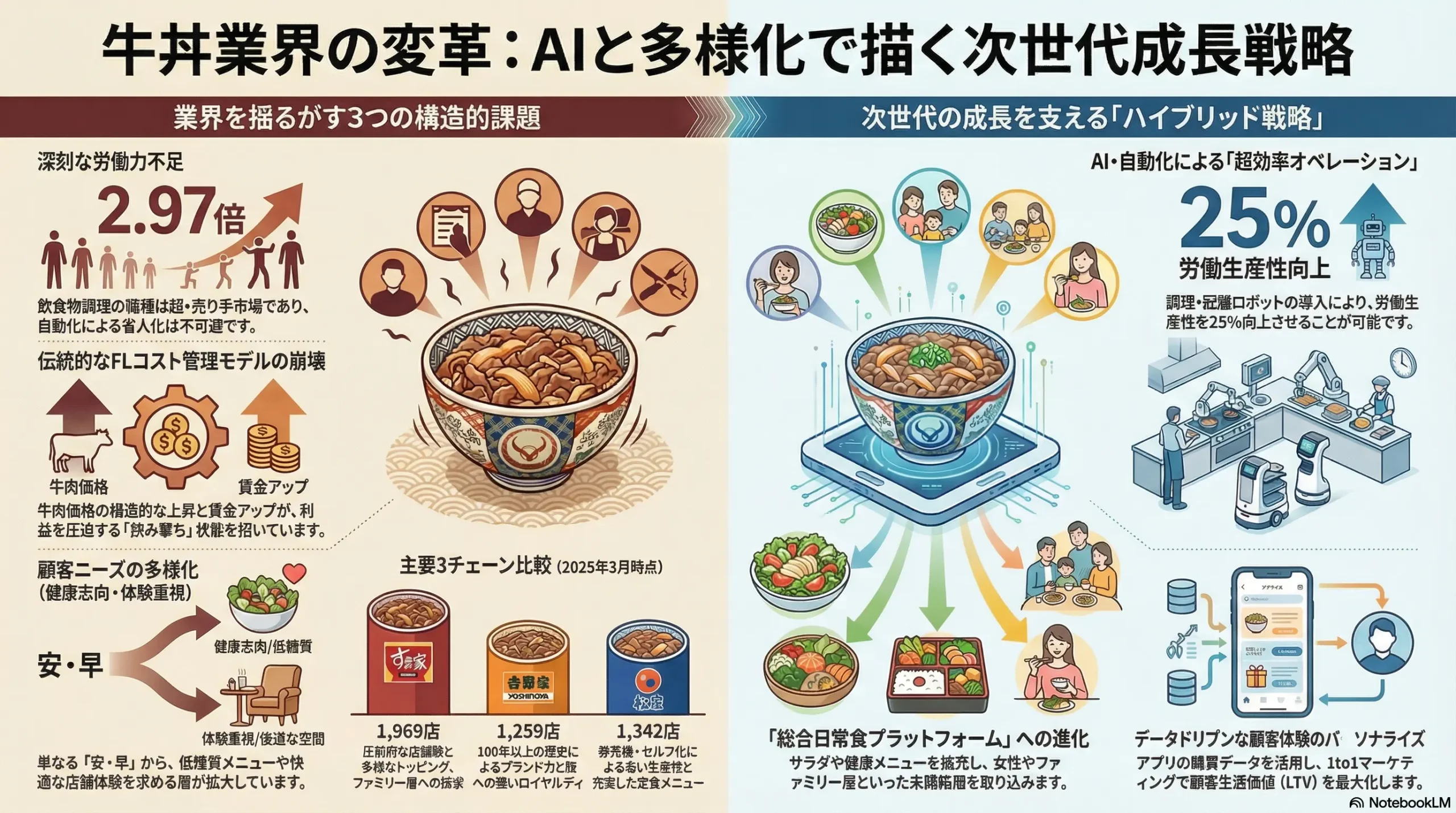 牛丼屋業界は現在、歴史的な転換点に立たされている。①牛肉をはじめとする原材料費とエネルギーコストの構造的な高騰、②深刻な労働力不足と最低賃金の上昇というダブルパンチによる、伝統的なFLコスト(食材費・人件費)管理モデルの崩壊。③「安くて早い」という従来の価値提供だけでは満たされない、健康志向や多様な食体験を求める消費者価値観への転換。④AIや自動化技術がもたらす、店舗オペレーションと経営モデルの根本的な変革可能性。これら3つの構造的課題は、既存のビジネスモデルに対する深刻な脅威であると同時に、業界のあり方を再定義し、新たな成長軌道を描くための千載一遇の機会でもある。