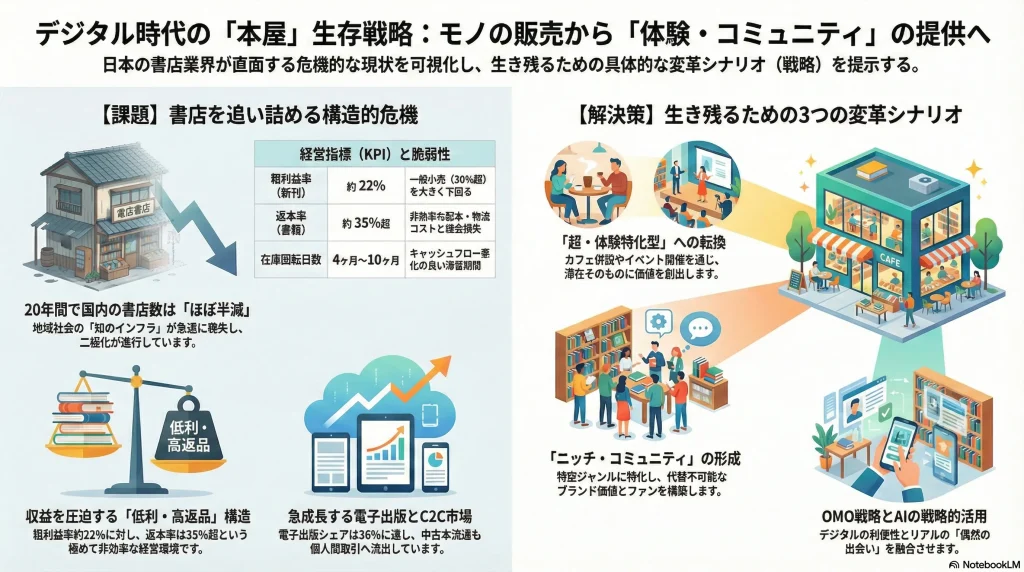 分析の結果、業界の将来は、以下の3つの転換を遂行できるか否かにかかっているという結論に至った。第一に、事業の核を「モノ(書籍)」の販売から「コト(体験・コミュニティ)」の提供へとシフトすること。第二に、リアル店舗という物理的空間の価値を再定義し、デジタル技術と融合させた独自の顧客体験を創出すること。第三に、高い返本率や画一的な配本といった課題を抱える伝統的なサプライチェーンから部分的に脱却し、収益構造を改善することである。今後の勝敗を分けるのは、もはや「何を売るか」ではなく、「顧客とどのように関わり、どのような場を提供できるか」という点に集約される。