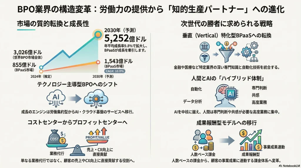 本分析が導き出す最も重要な結論は、「BPO業界の未来は、労働力の提供者(Labor Provider)から、AIを駆使して顧客の事業成果を共創する知的生産パートナー(Intellectual Production Partner)への変革に懸かっている」ということです。単なる業務の効率化請負に留まる企業はコモディティ化と価格競争の渦に沈む一方、業界特化の深い専門知識と先進技術を融合させ、顧客のDX推進や事業変革そのものをサービスとして提供できる企業が、次世代の勝者となります。市場は全体として成長を続けますが、その内実は「従来型BPOの縮小・代替」と「高付加価値・技術主導型BPOの急拡大」という二極化が進行します。