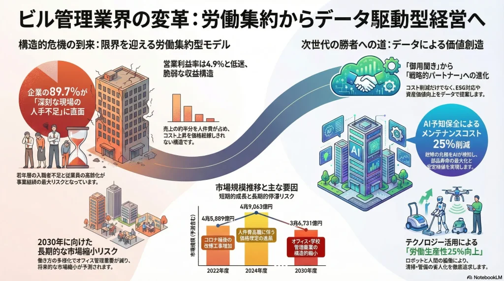 日本のビル管理業界は、従来の労働集約型ビジネスモデルの限界という歴史的な岐路に立たされている。市場規模は人件費やエネルギーコストの高騰を価格転嫁することで名目上は拡大傾向にあるものの 1、営業利益率は約4.9%と低水準で推移しており 3、収益構造は極めて脆弱である。企業の9割近くが「現場従業員が集まらない」と回答するほどの深刻な人手不足 4 は、もはや事業継続を脅かす最大の経営リスクとなっている。