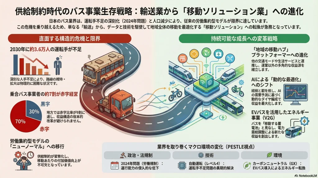 日本のバス事業を支えてきた労働集約型のビジネスモデルは、「2024年問題」を契機にその限界が露呈し、供給制約が常態化する「ニューノーマル」へと不可逆的に移行した。運転手の時間外労働規制強化は、単なる一過性の課題ではなく、業界のコスト構造とサービス提供能力を恒久的に変質させる構造変化である 1。この結果、従来の路線網を維持・拡大することによって成長を目指す戦略は、物理的にも経済的にも破綻しつつある 2。