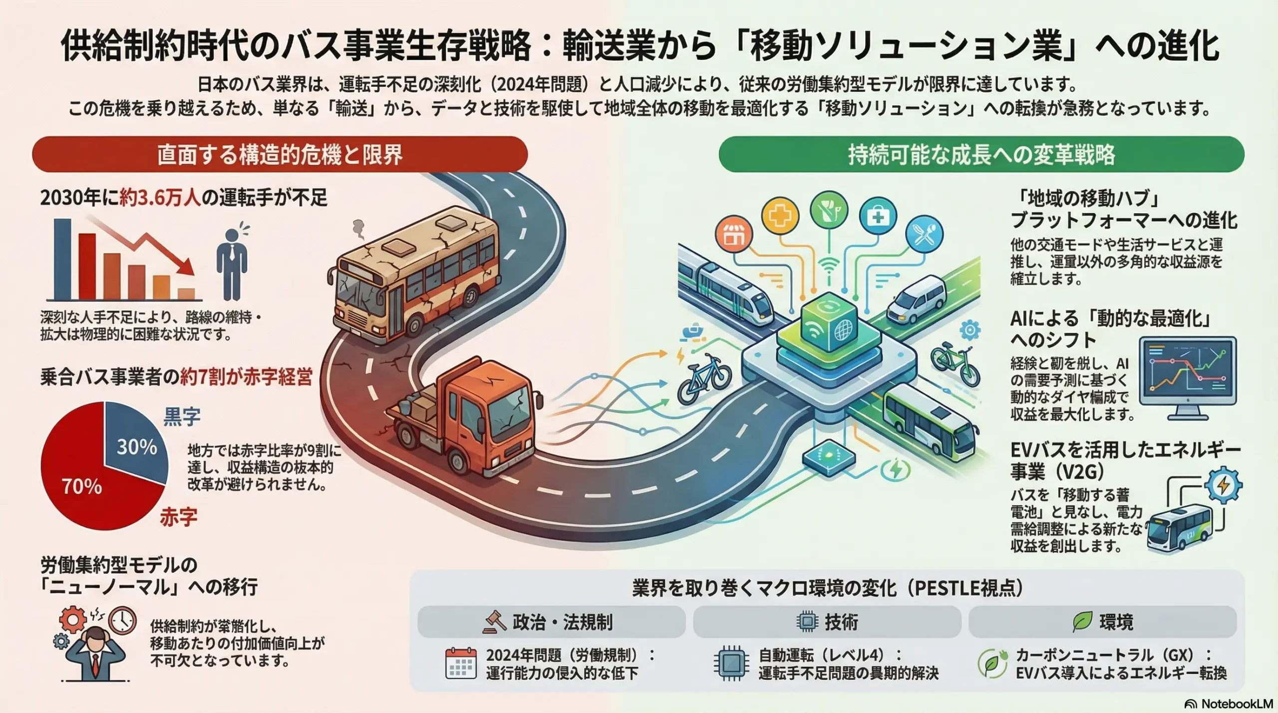 本レポートは、日本のバス事業者が直面する構造的課題と歴史的な事業機会を多角的に分析し、持続可能な成長を実現するための事業戦略オプションを提言することを目的とする。業界は、深刻な運転手不足(「2024年問題」)と地方の人口減少という根深い課題に直面する一方で、MaaS(Mobility as a Service)の進展、インバウンド観光の回復、そして脱炭素化(GX)という不可逆的なメガトレンドにより、大きな変革期を迎えている。