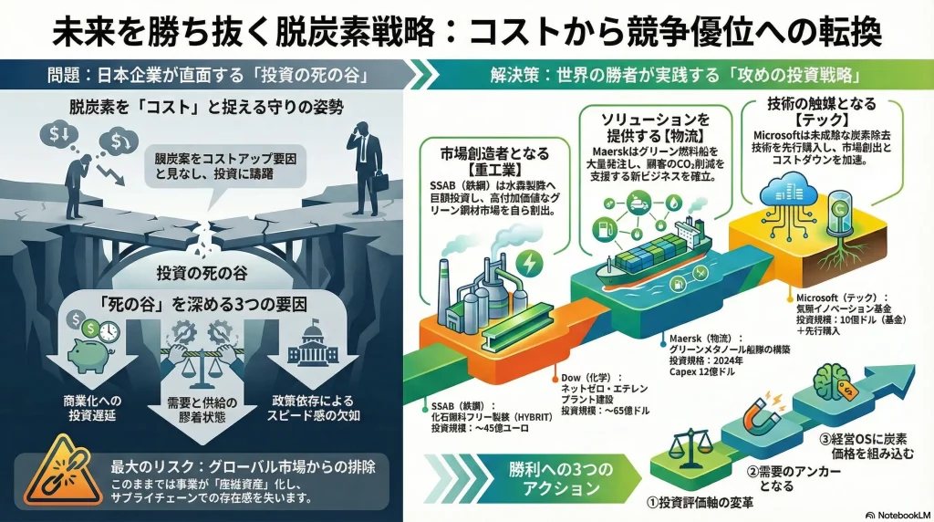 日本企業の多くは、技術的な実証が完了しても、商用規模へのスケールアップ投資において躊躇する傾向があります。これに対し、欧州企業(例:SSAB、Maersk)は、技術が未成熟でコストが高い段階から、巨額の設備投資(Capex)とオフテイク(長期購入契約)を断行しています。彼らは「市場ができてから参入する」のではなく、「自らの投資によって市場を創り出し、ルールを支配する」戦略を採っています。