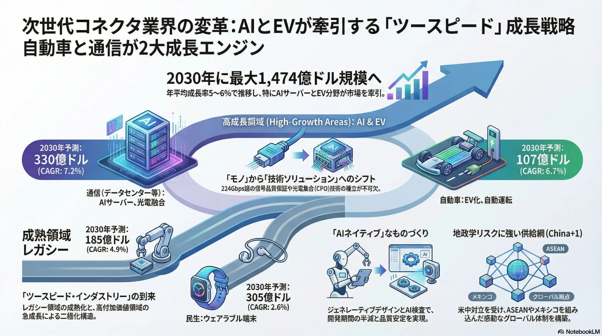 コネクタ業界は、全体としては年率4%~7%の中成長市場であるが、その内実は「レガシー領域の成熟化」と「高付加価値領域の急成長」が混在する二極化した構造、すなわち「ツースピード・インダストリー(Two-Speed Industry)」へと急速に変貌している。今後の業界における勝者と敗者を分ける決定的な要因は、従来の物理的な接続性(メカニカルな信頼性や小型化)の追求から、高速・大容量データの品質をいかに保証するかという「シグナル・インテグリティ(信号品質)」、さらには光電融合のようなシステムレベルでのソリューション提案能力への転換を、いかに迅速かつ効果的に実行できるかという点に集約される。価値の源泉が「モノ」から「技術・ソリューション」へとシフトする中で、従来のビジネスモデルの延長線上に未来はない。