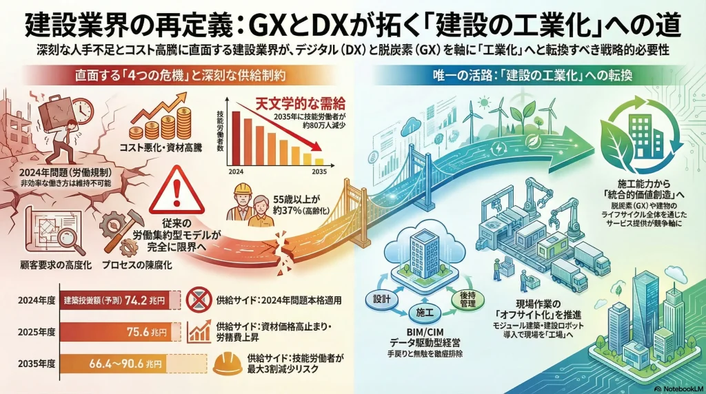 日本の建設業界は、①労働力供給の制約(2024年問題、技能労働者の高齢化)、②コスト構造の悪化(資材・エネルギー価格の高騰)、③顧客要求の高度化(脱炭素、デジタル化)、④生産プロセスの陳腐化という4つの危機に同時に直面している。これにより、従来の労働集約型ビジネスモデルは完全に限界を迎えた。 - 結論2:「建設の工業化(Industrialization)」が唯一の活路