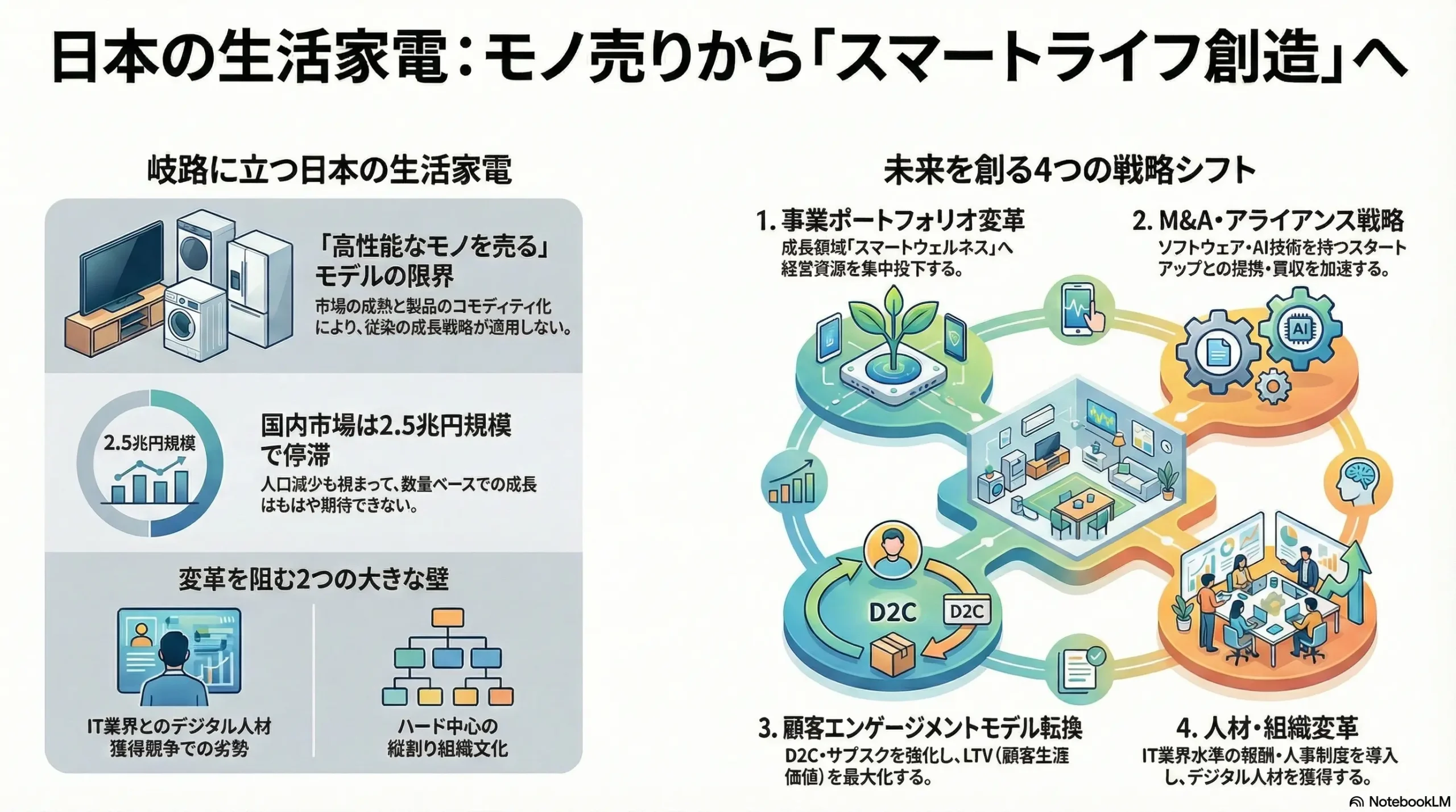 本レポートは、日本の生活家電業界が直面する構造的転換点を分析し、2035年までの持続的成長に向けた戦略的針路を提示するものです。テクノロジーの進化と顧客価値観の変容は、従来の「高性能なモノを売る」ビジネスモデルの限界を露呈させ、業界に根本的な変革を迫っています。