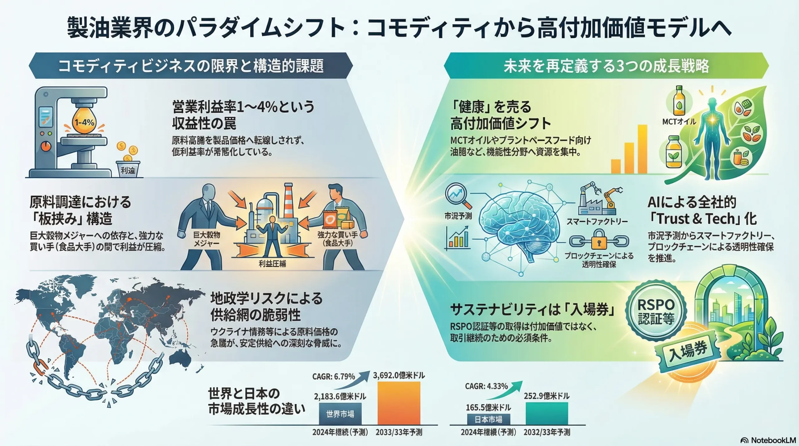 これは、単に製品ラインナップを調整するレベルの戦術的変更では対応不可能な、事業の根幹に関わるパラダイムシフトです。もはや企業は単なる「油を売る」存在ではありません。これからの成長は、「健康ソリューションの提供者」「サステナブルな食料供給の担い手」、そして「顧客の製品開発を支援する技術パートナー」としての新たな価値を提供できるかどうかにかかっています。この変化に適応できない企業は、収益性の低い汎用品市場で消耗戦を強いられ、やがて淘汰されるリスクに直面します。