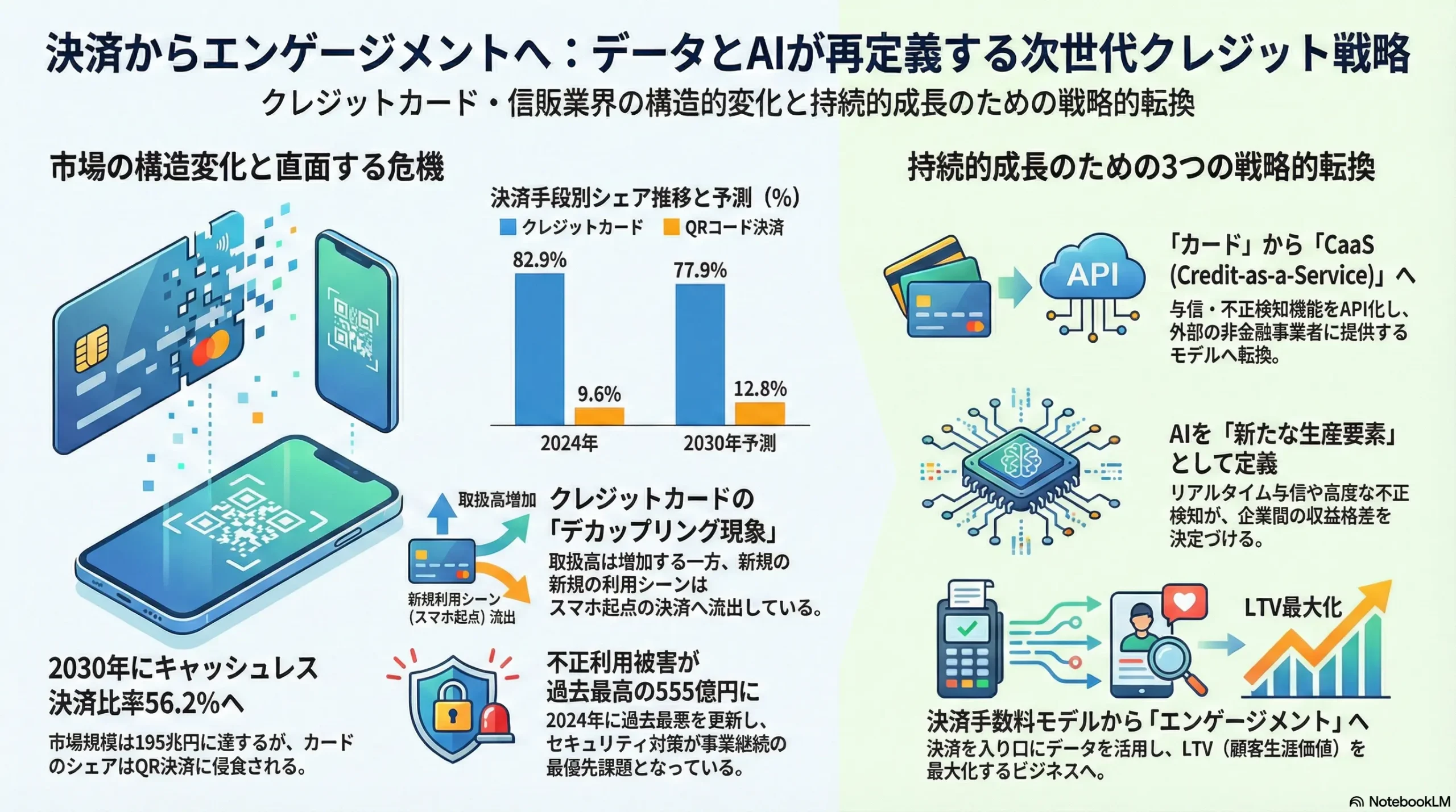 - 利便性とUXの向上: 非接触決済やアプリを通じた利用明細のリアルタイム確認など、デジタル技術による利便性の向上が、消費者の利用意欲を高めている 14。