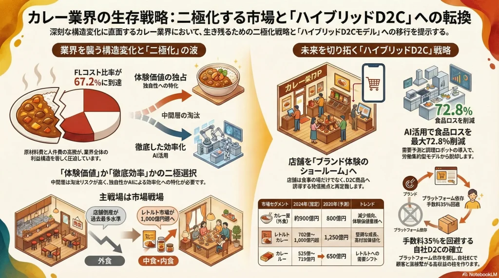 カレー屋業界は、単なる「飲食業」から、「体験価値提供業」と「効率化を極めた食品製造・物流業」への二極分解が不可逆的に進行している。この両極のいずれかに戦略を振り切ることなく、中間領域で旧来のビジネスモデルを続ける事業者は、コスト高騰と競争激化の波に飲まれ、淘汰されるリスクが極めて高い。