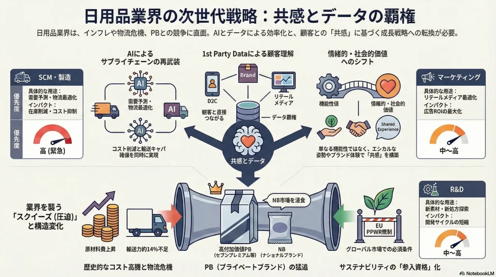 日用品業界の競争軸は、「マス市場での棚の確保」と「オペレーション効率」から、「①顧客との共感(エンゲージメント)の構築」と「②データ(1st Party Data)の覇権」を巡る争いへと不可逆的にシフトした。サステナビリティ対応 1 やパーソナライゼーション 3 は「共感」の、D2C(Direct-to-Consumer) 5 とリテールメディア 6 は「データ」の主戦場である。