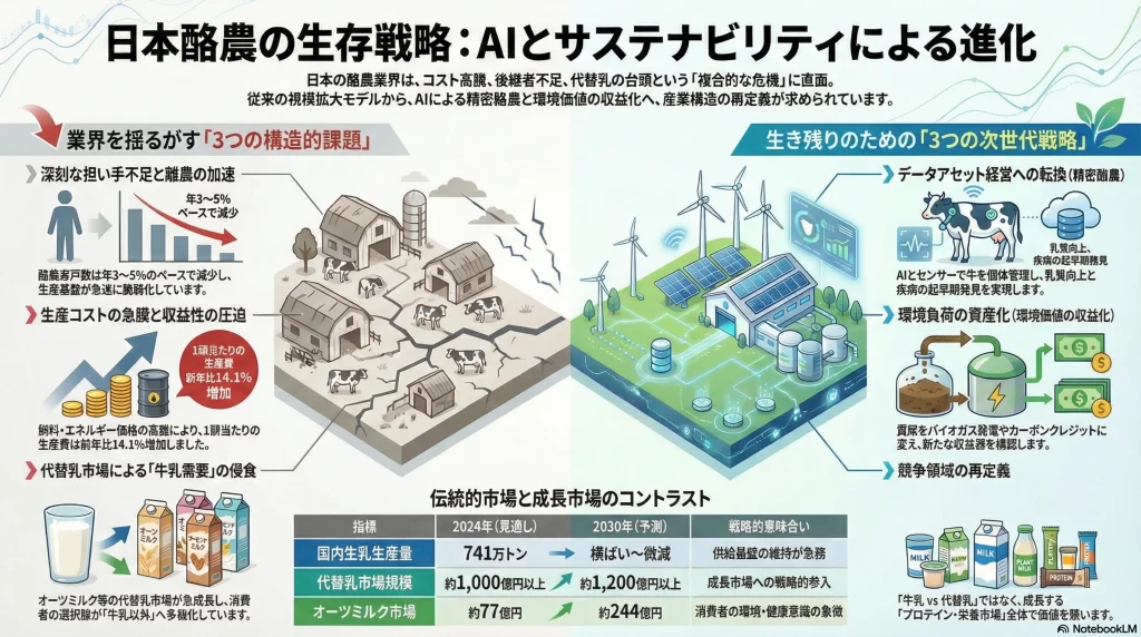 日本の酪農業界は、深刻な後継者不足、飼料・エネルギーコストの高騰、環境負荷への社会的要請、そして「代替乳」という破壊的イノベーションの台頭という、複合的な危機に直面している。規模と効率を追求する従来の成長モデルは限界を迎え、業界は生存と進化の岐路に立たされている。しかし、この構造変化は、新たな価値創造の機会をもたらすものでもある。本分析の結論として、今後の勝敗を分けるのは、従来の「生乳」というモノ(商品)の生産・販売から脱却し、AIと精密酪農技術を駆使して「データ」「乳質」「環境価値」という無形の資産を収益化できるか否かにある。代替乳との競争を脅威としてのみ捉えるのではなく、プロテイン・栄養市場全体における自社のポジショニングを再定義する好機と捉える視点が不可欠である。