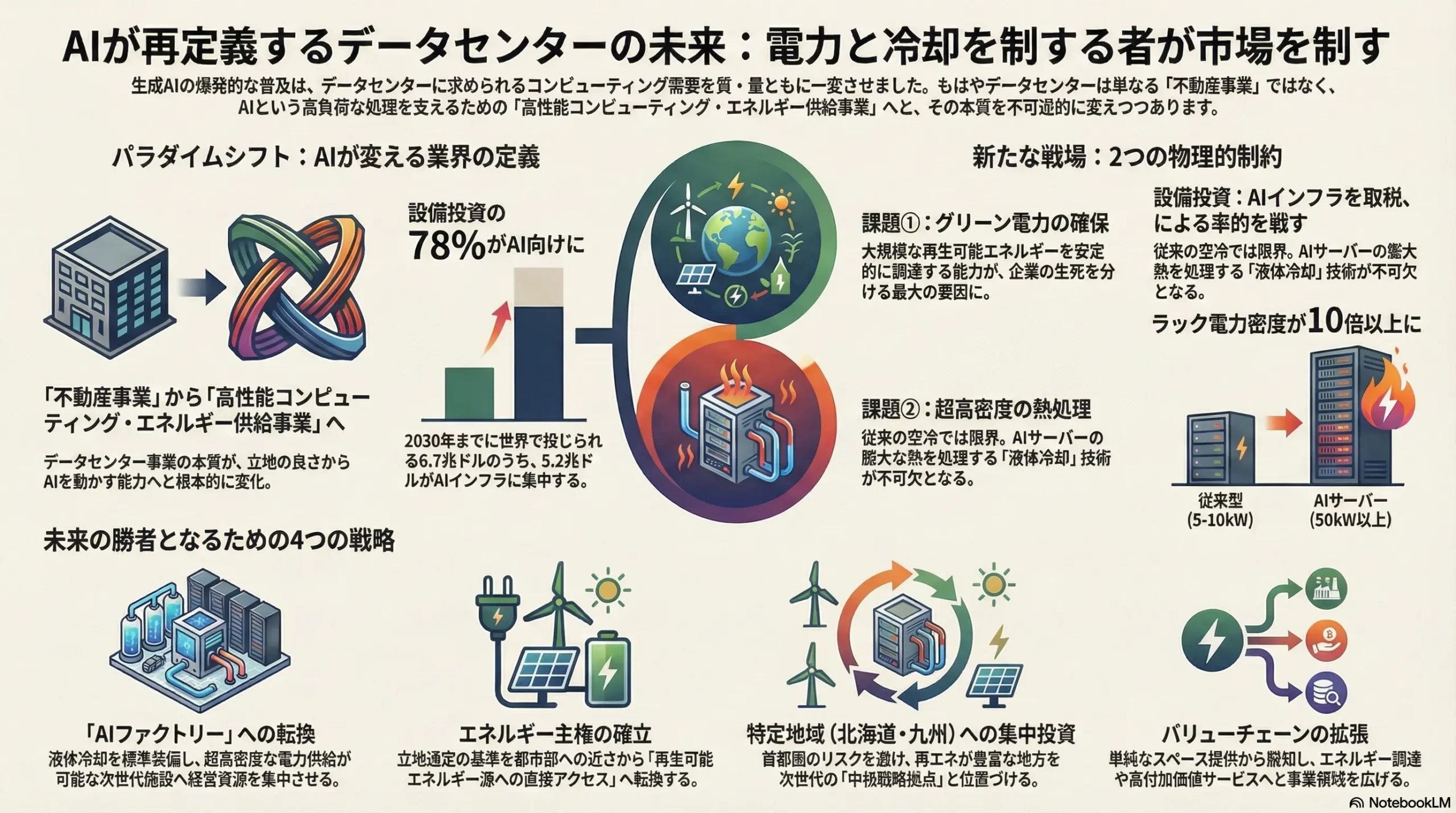 データセンター事業は、もはや単なる「不動産・設備事業」ではない。その本質は、生成AIという極めて特殊かつ高負荷なワークロードを安定的かつ効率的に稼働させるための「高性能コンピューティング・エネルギー供給事業」へと、不可逆的な変容を遂げている。このパラダイムシフトの本質を理解し、事業構造を適応させられないプレイヤーは、たとえ現在優良な資産を保有していたとしても、今後3年から5年の間に急速に競争力を失い、陳腐化するリスクに直面する。勝者と敗者を分ける最大の要因は、もはや立地の良さや運用実績だけではない。「グリーンな電力を大規模に確保する能力」と「超高密度な熱を処理する技術(液体冷却)」という、二つの物理的な制約を克服できるか否かにかかっている。