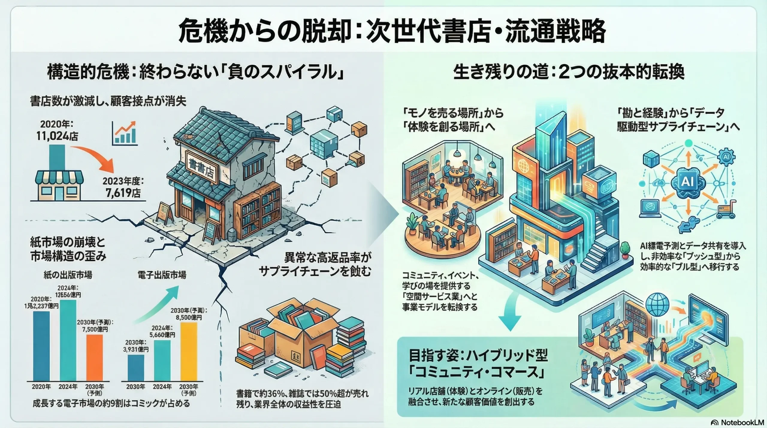 この深刻な状況を打開する鍵は、二つの根本的な転換にある。第一に、リアル店舗の価値を「モノ(本)を売る場所」から、顧客が時間と費用を投じてでも訪れたいと願う「体験とコミュニティを創出するプラットフォーム」へと完全に再定義することである。第二に、業界全体のサプライチェーンを、長年の勘と経験に依存する非効率な「プッシュ型」から、リアルタイムデータを活用し実需に基づき商品を供給する「プル型」へと抜本的に転換するデジタルトランスフォーメーション(DX)を断行することである。この二つの転換を両輪で進めることでのみ、持続可能な未来を描くことが可能となる。