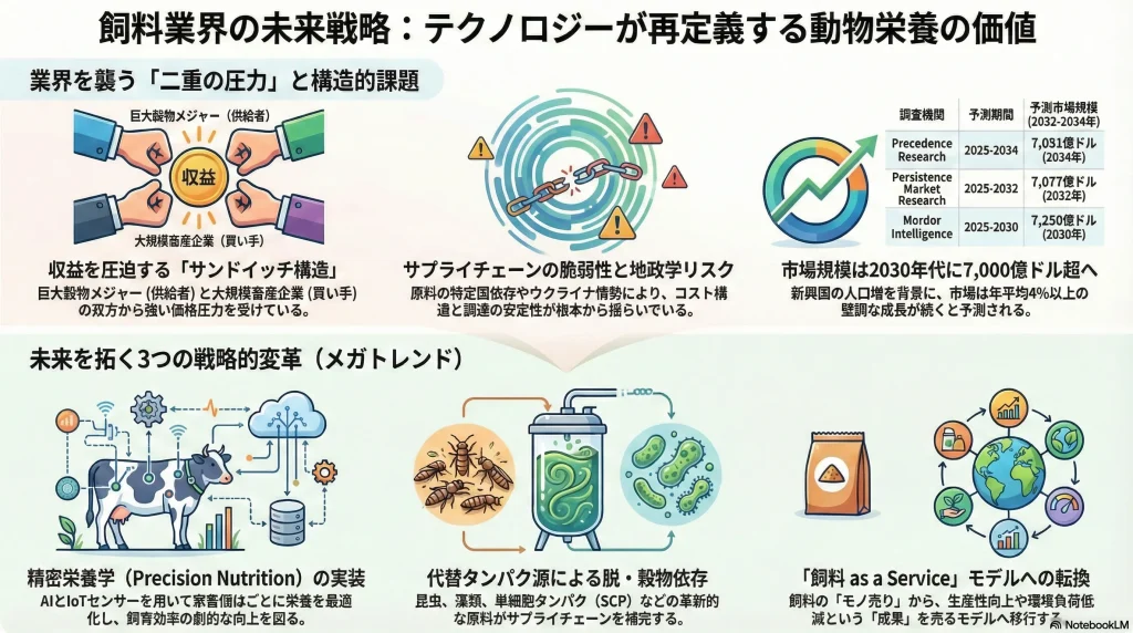 2. 精密栄養学(Precision Nutrition)の進化: AI、IoT、センサー技術を活用し、家畜の個体・群単位で栄養を最適化する「精密飼料」は、飼料の付加価値を飛躍的に高め、単なる「モノ」から「ソリューション」へとビジネスモデルを転換させます。