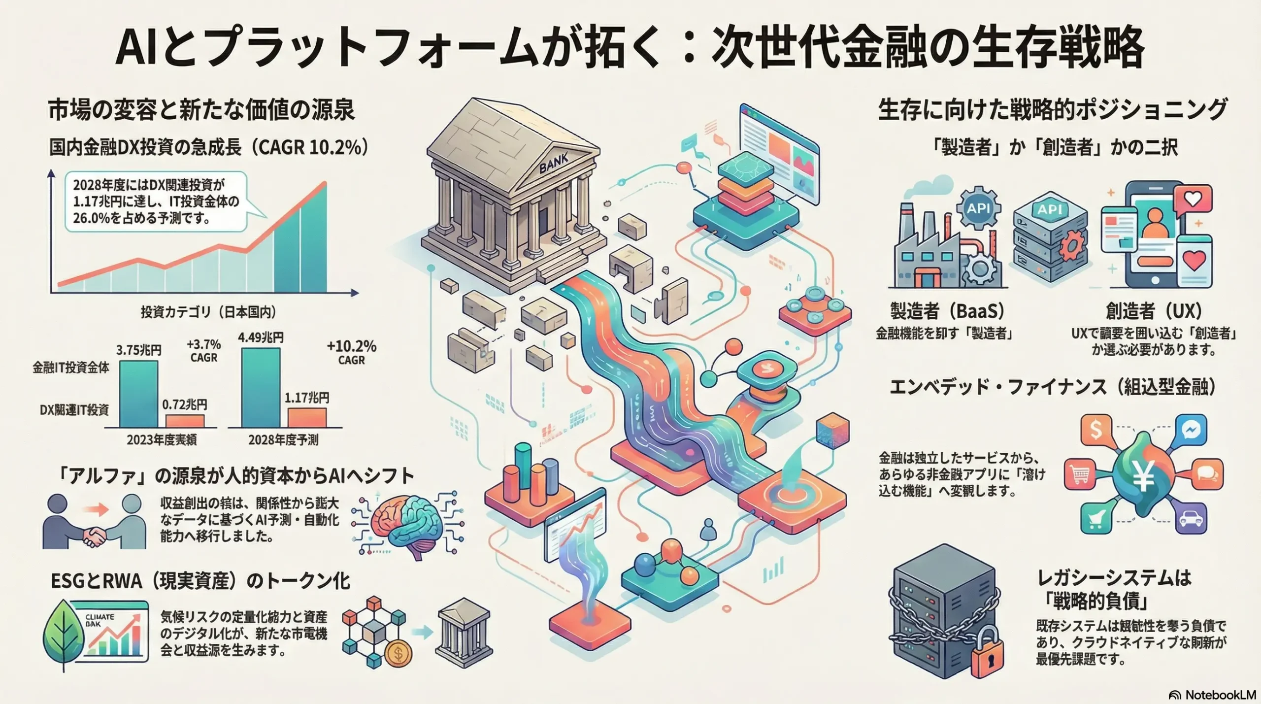 - プラットフォームという最終戦場(The Platform Imperative): エンベデッド・ファイナンス(組込型金融)の進展により、金融は独立したサービスから、あらゆる非金融プラットフォームに「溶け込む」機能へと変貌する。主戦場は金融商品の販売から、顧客との最終接点(インターフェース)とエコシステムの支配権を巡る争奪戦へと移行した。