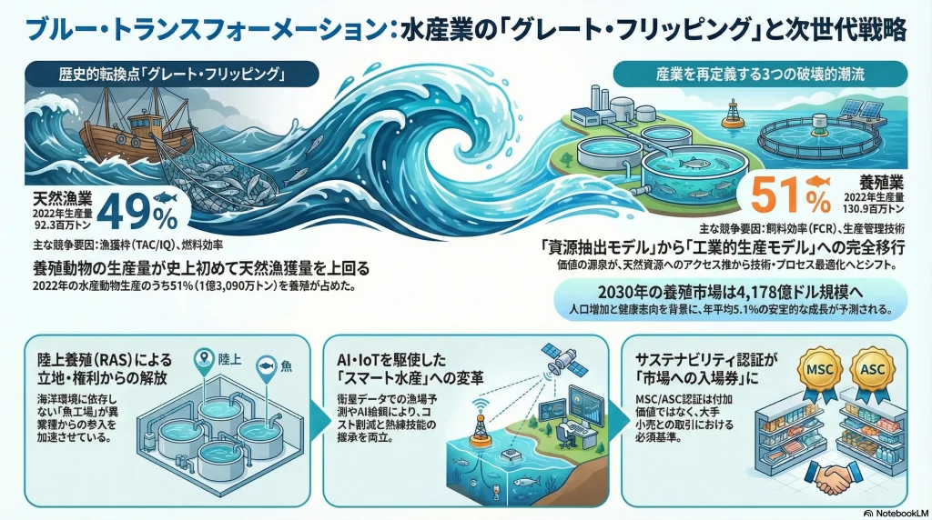 水産業界は、供給源の主役が天然から養殖へと交代する「グレート・フリッピング」を迎え、不可逆的な転換点にある。この変革は、3つのメガトレンドによって加速されている。