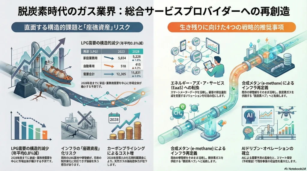 3. AIドリブン・オペレーションの確立: AIによる高精度な需要予測に基づくLNG調達の最適化、およびスマート保安による設備の予知保全とメンテナンスコストの削減を徹底し、既存事業の収益性を最大化する。これにより創出されたキャッシュを、EaaSなどの新規事業へ再投資する好循環を構築する。