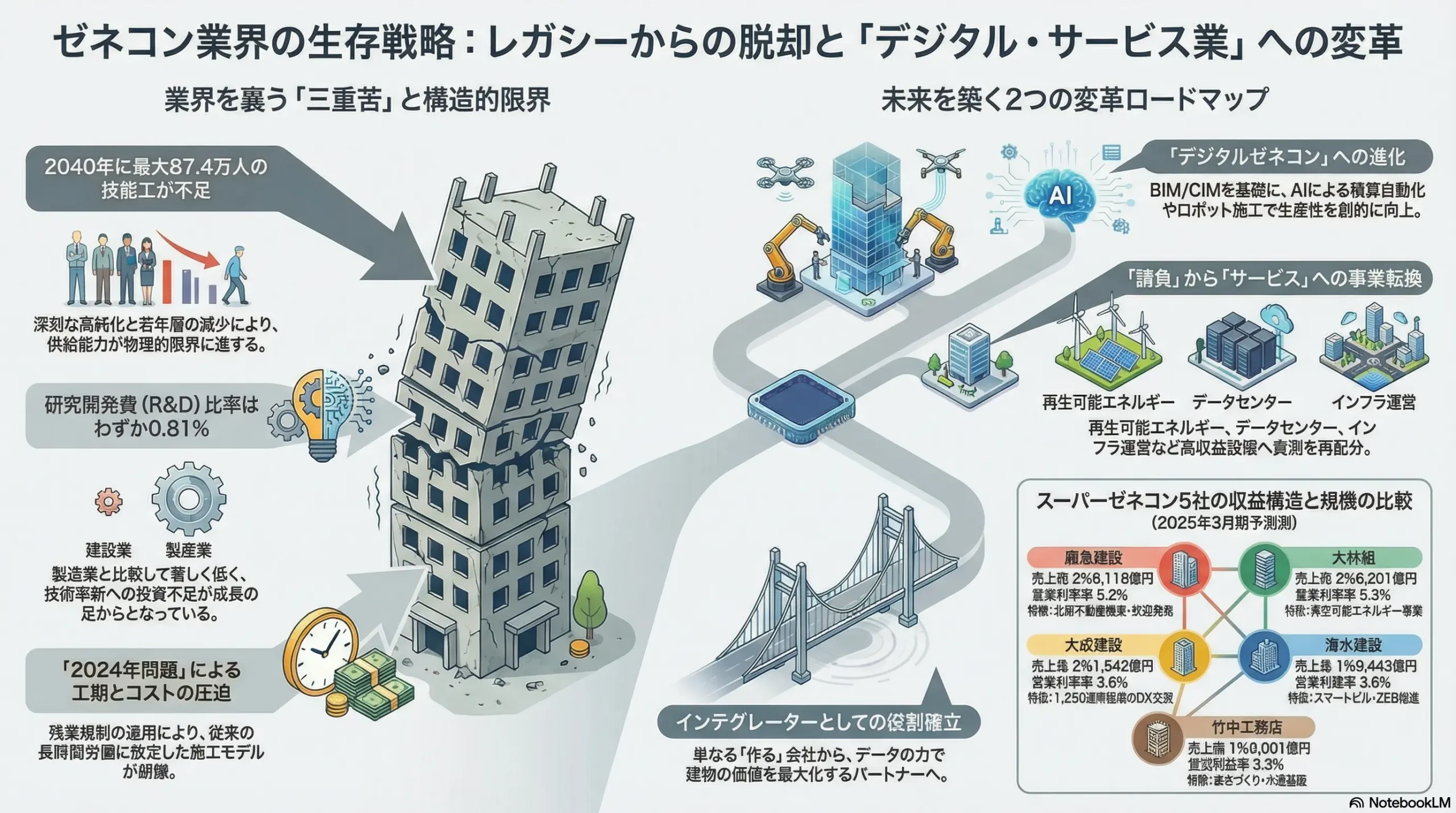 ゼネコン業界は、従来の「請負・施工」を中心とするビジネスモデルが、収益性の観点から構造的な限界に達している歴史的な転換点にある。今後の業界における勝者と敗者を分ける決定的な要因は、もはや個別の施工能力の優劣ではない。「デジタル技術を駆使した生産性改革」と「建設物のライフサイクル全体を収益化するサービスモデルへの転換」という二つの変革を、いかに迅速かつ大胆に実行できるかである。特に、2024年4月から適用された働き方改革関連法、通称「2024年問題」は、単なるコスト増加要因として捉えるべきではない。これは、旧来の労働集約型モデルからの脱却を強制し、BIM/CIMやAI、建設ロボットといったテクノロジーの本格導入を不可逆的に進める最大の触媒と位置づけるべきである。