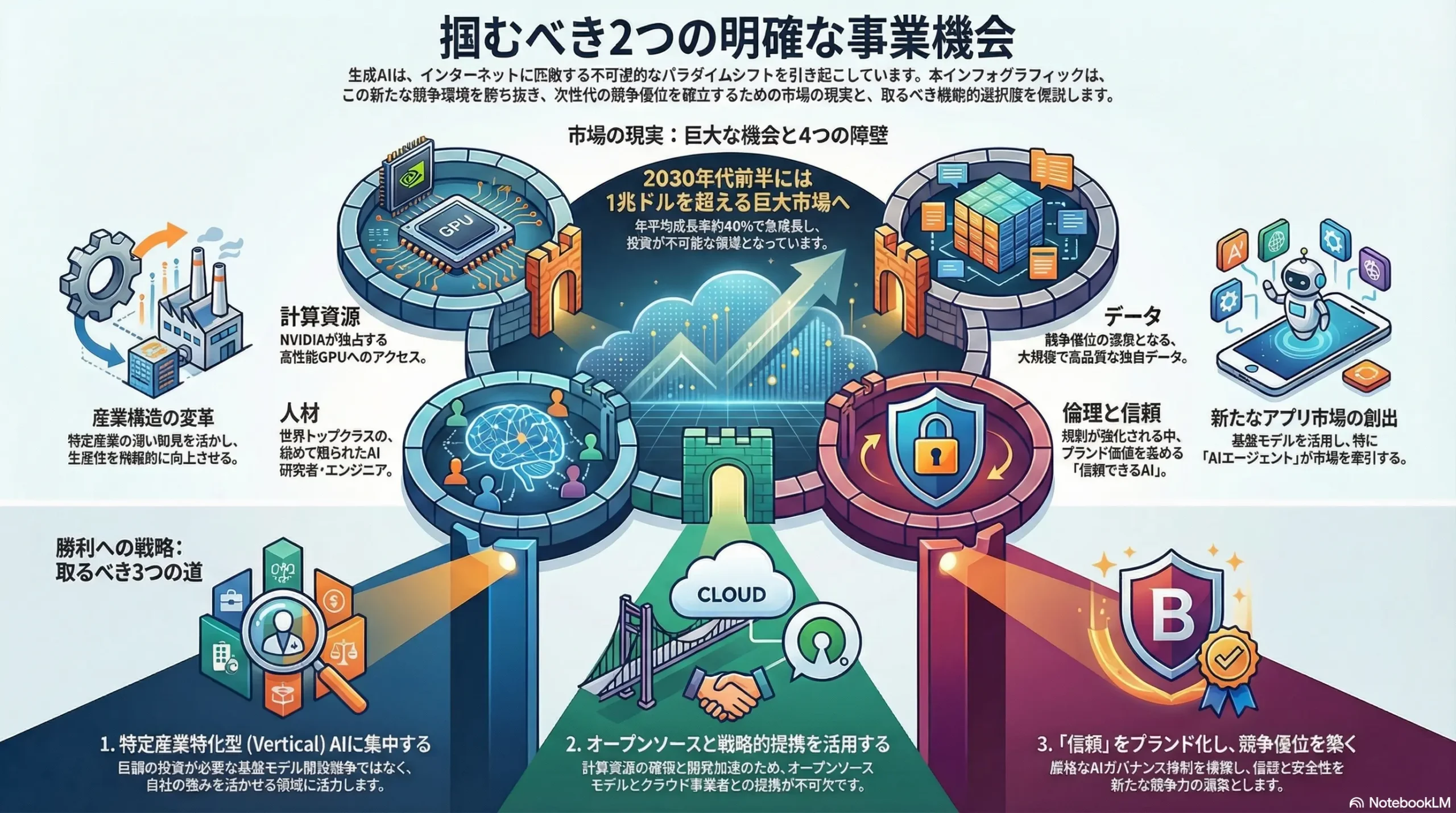 - データ (Data): 基盤モデルの性能がコモディティ化し始める中、大規模かつ高品質な独自データセットが、最も持続可能な競争優位の源泉となりつつある。