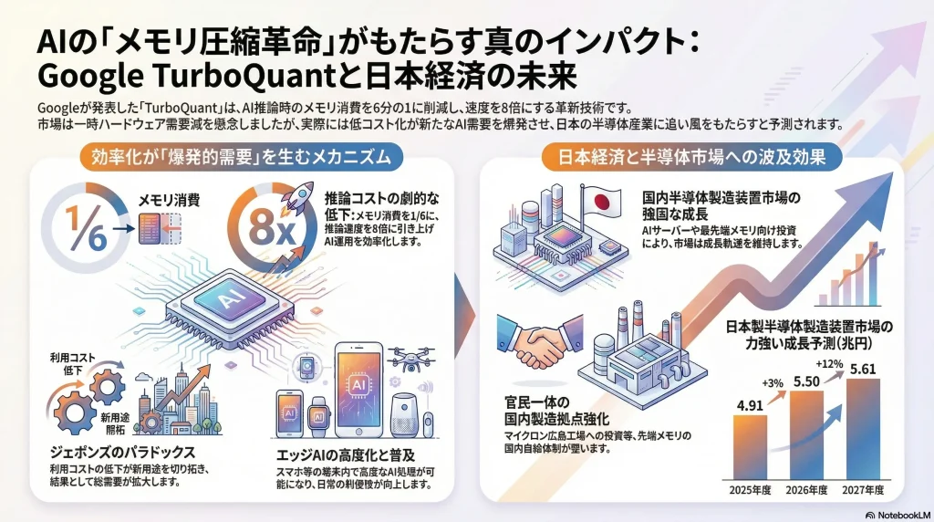 Googleの圧縮技術による効率化の波は、日本の主要産業である半導体製造装置市場や材料産業に対しても、需要の質的転換と継続的な投資機会をもたらす。