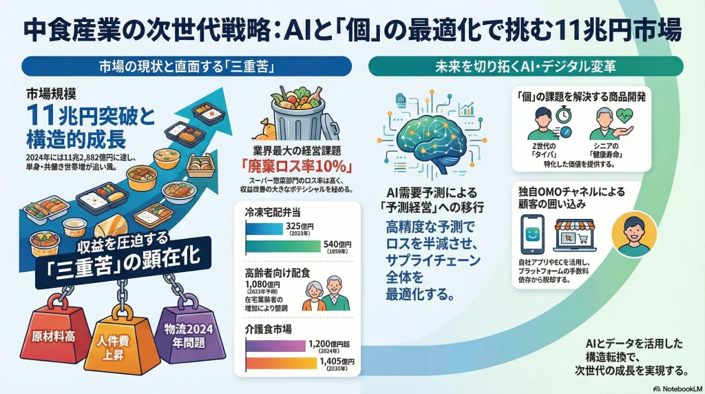 中食業界は、単なる「マス向けの利便性」の提供から、個々のライフスタイルや健康課題を解決する「ソリューション」提供への歴史的転換点にある。この変革を成功に導く鍵は、第一にデータとAIを活用したバリューチェーン全体の最適化、とりわけ需要予測精度向上による食品ロス削減である。第二に、多様化する「個」のニーズに応えるパーソナライズド商品の開発能力の獲得。そして第三に、リアル店舗とデジタルチャネルを融合させたシームレスな顧客体験(OMO: Online Merges with Offline)の構築である。原材料費、人件費、物流費の高騰という「三重苦」は、短期的には深刻な脅威であるが、長期的には旧来の労働集約型・大量生産モデルからの脱却を促す最大の触媒として機能する。