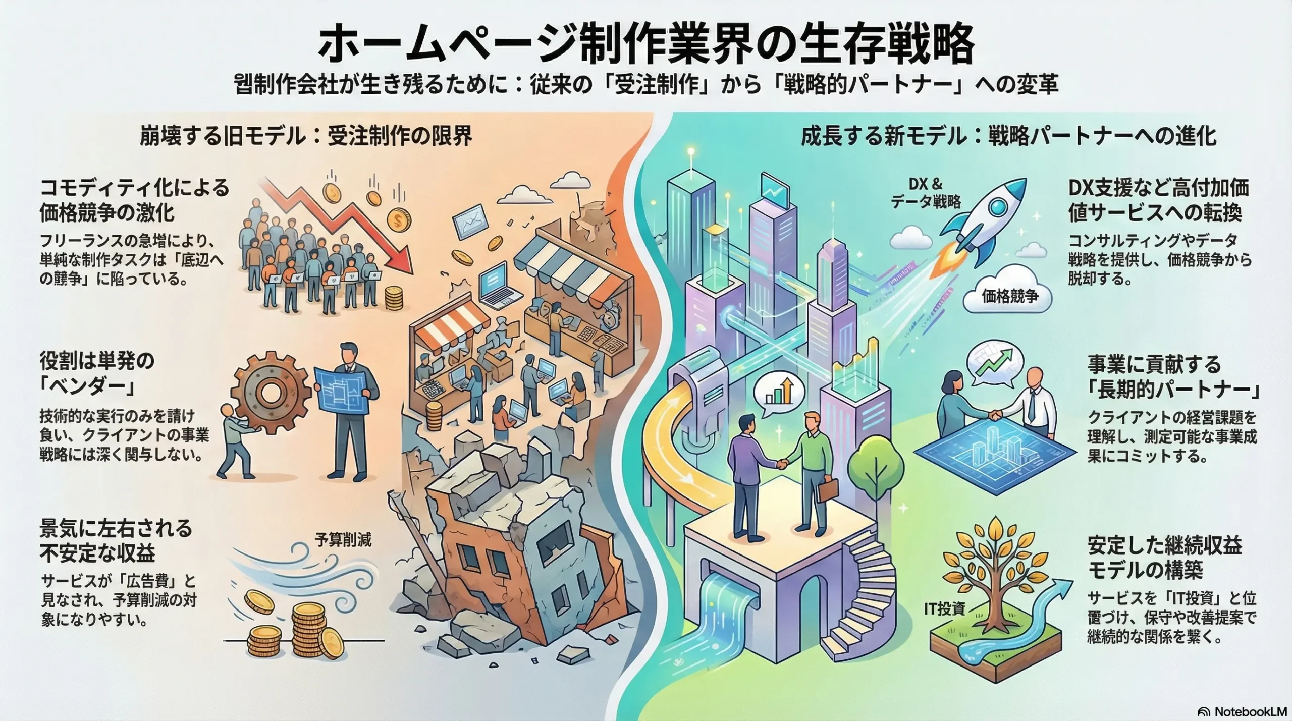 市場の需要は、単純な「ウェブサイトを作ってほしい」という依頼から、「デジタルツールを使って事業を変革したい」という複雑な経営課題へと進化している。この変化は、クライアントとの関係性を、単発の受発注を行う「ベンダー」から、長期的な視点で伴走する「戦略的パートナー」へと根本的に変えるものである。