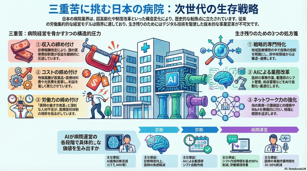 - AIを駆使した業務改革「AI-Powered Operational Overhaul」に着手せよ: 「医師の働き方改革」がもたらす直接的なインパクトを緩和するため、病院運営の根幹業務、特に医師の事務作業(AIによるカルテ作成支援)、看護師のシフト管理、病床管理(ベッドコントロール)を対象としたAI駆動型ソリューションへの即時投資を開始すべきである。