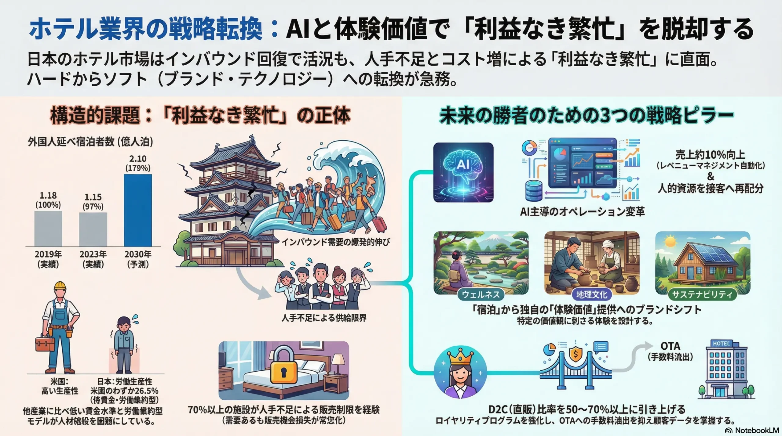 分析の結果、日本のホテル市場はインバウンド需要の歴史的な回復を追い風に、客室単価(ADR)や販売可能な客室あたりの収益(RevPAR)といった主要業績評価指標(KPI)がコロナ禍以前を上回る活況を呈している。しかし、その華やかなトップライン成長の裏側では、構造的かつ深刻な人手不足が供給能力を制約し、人件費や業務委託費の急騰が利益を著しく圧迫する「利益なき繁忙」とも言うべき危機的状況が進行している。
