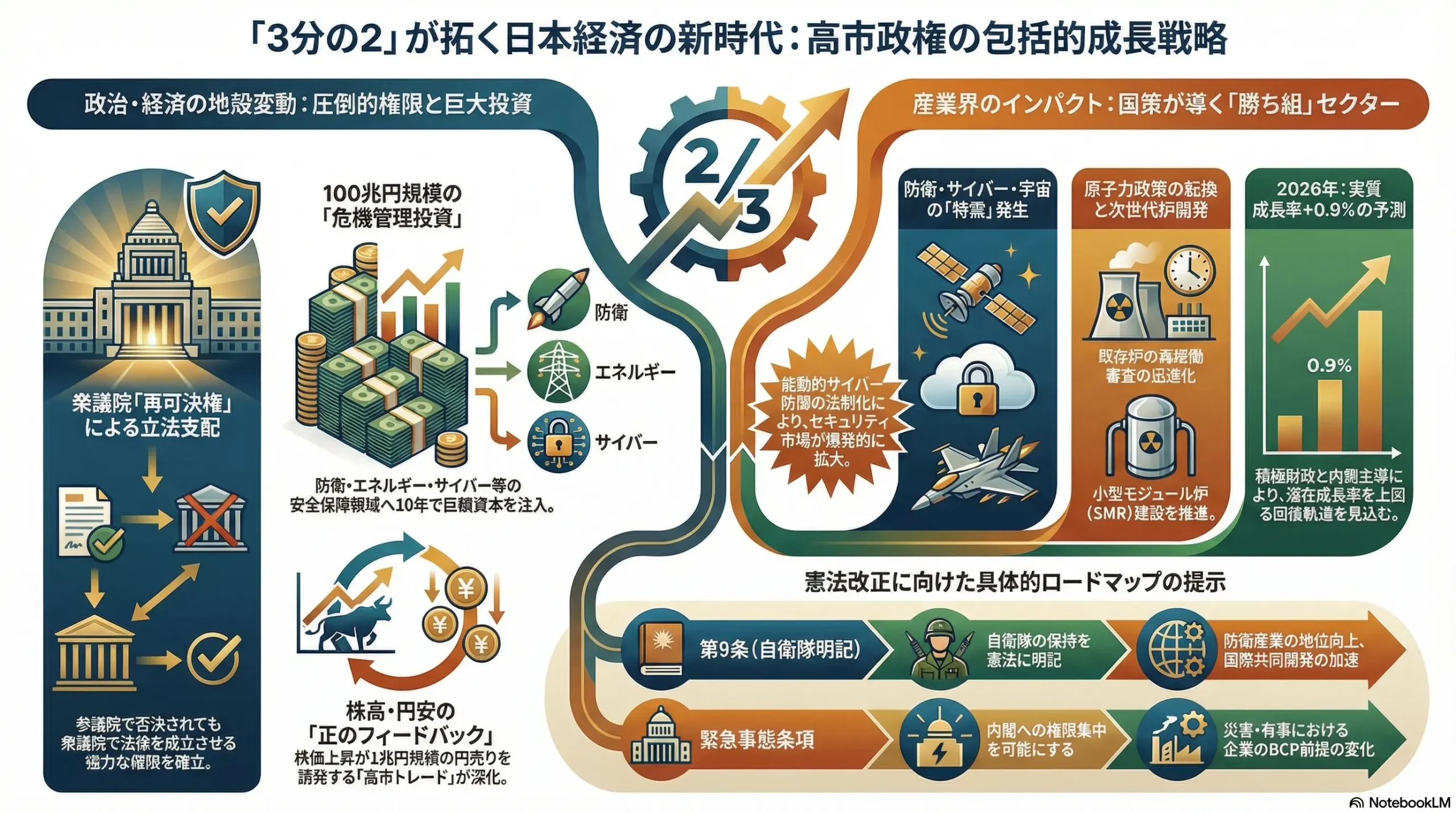 本報告書は、この政治的地殻変動が2026年以降の日本経済、産業構造、企業経営、そして国民生活に及ぼす影響を、マクロ経済学的視点、地政学的リスク、および産業別ミクロ分析を通じて多角的に深掘りするものである。