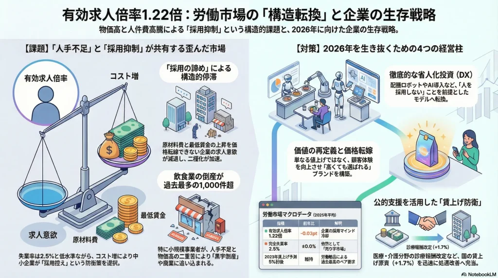 2025年の日本経済は、労働市場における象徴的な数値の悪化とともに一つの時代を画した。厚生労働省が発表した2025年平均の有効求人倍率は1.22倍となり、前年から0.03ポイント低下、2年連続の下落を記録した1。この数値は、単なる景気循環の一局面としての「踊り場」を示しているのではない。それは、長年日本経済を支えてきた「労働集約型」のビジネスモデルが、物価高騰と人手不足という二重の圧力によって構造的な限界を迎え、企業の採用行動が「拡大」から「選別」、あるいは「生存のための縮小」へと劇的にシフトし始めたことを示唆するクリティカルなシグナルである。