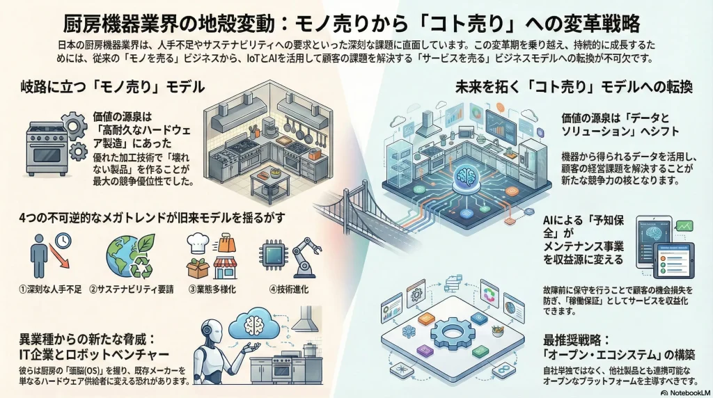厨房機器業界は、その歴史上、最も重大な岐路に立たされている。競争の主戦場は、高耐久・高効率なハードウェアを製造・販売する「モノ売り」から、IoTで収集したデータをAIで解析し、顧客の厨房運営全体の課題を解決するソリューションを提供する「コト売り」へと決定的にシフトしつつある。この地殻変動に適応し、ビジネスモデルのサービス化(Servitization)を断行できるか否かが、今後5年から10年における企業の勝敗を分ける唯一最大の要因である。