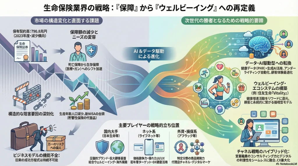 日本の生命保険業界は、その存在意義そのものが問われる岐路に立たされている。従来のビジネスモデル、すなわち「万一のリスクに備える保障(Protection)を、営業職員のプッシュ型販売で提供する」という成功方程式は、もはや機能不全に陥りつつある。市場の構造的縮小が不可逆である以上、既存のパイを奪い合う消耗戦の先に成長はない。