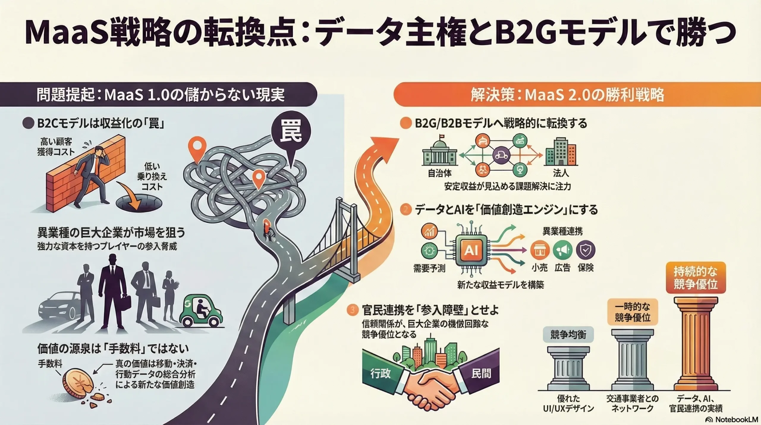 - B2G (Business-to-Government): 自治体や政府機関と連携し、公共サービスの一環としてMaaSを提供するモデル。社会課題解決に貢献することで、補助金や独占的な事業機会を得られる可能性がある。最も成長が期待される分野の一つである 5。