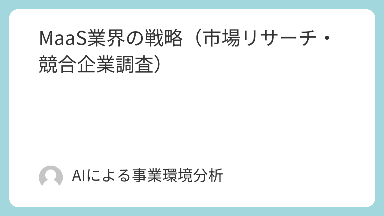 - 競争の主戦場はエコシステム間の覇権争いへ: 競争はもはや個々のMaaSアプリ間ではなく、異なる思想を持つエコシステム(自動車OEM主導の垂直統合型、巨大IT企業主導の水平展開型、交通事業者主導の既存アセット活用型など)間の覇権争いとなっている。この中で、どのエコシステムが「オーケストレーター」として業界標準を確立するかが、今後の勝敗を分ける。