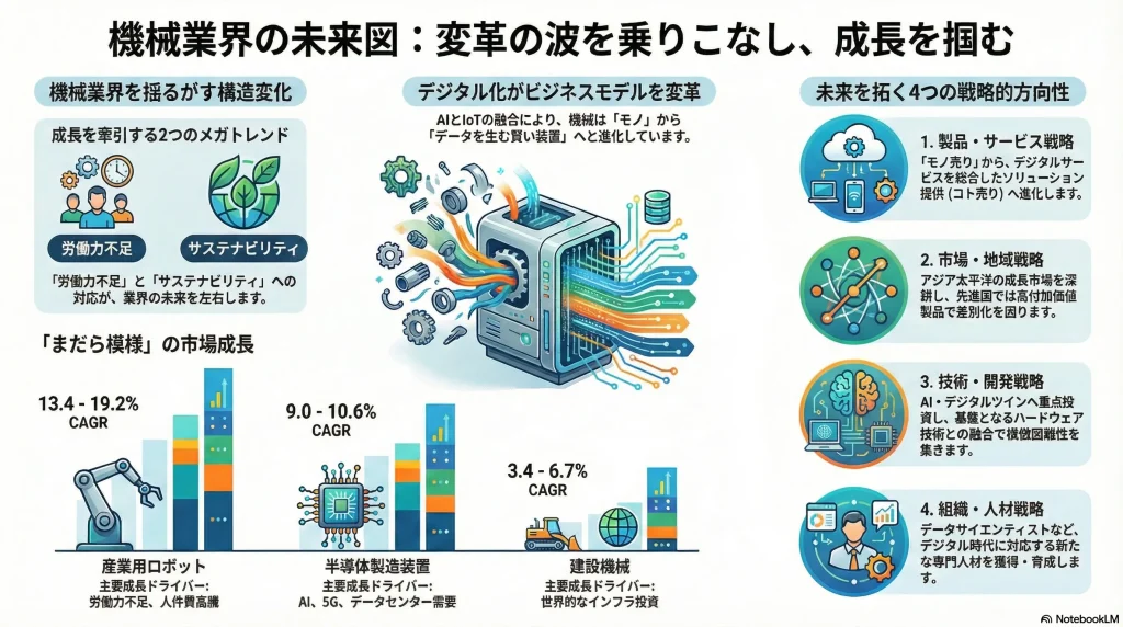 この事実は、機械業界における成長の源泉が、物理的な「モノづくり」を効率化する伝統的な機械から、デジタル社会の基盤そのものを構築し、人間の労働を高度に代替・支援するインテリジェントな機械へと、重心を移しつつあることを明確に物語っている。この構造的シフトを理解することは、企業の資源配分やM&A、研究開発の方向性を決定する上で極めて重要である。次章以降では、これらの各セクターについて、より詳細な分析を行っていく。