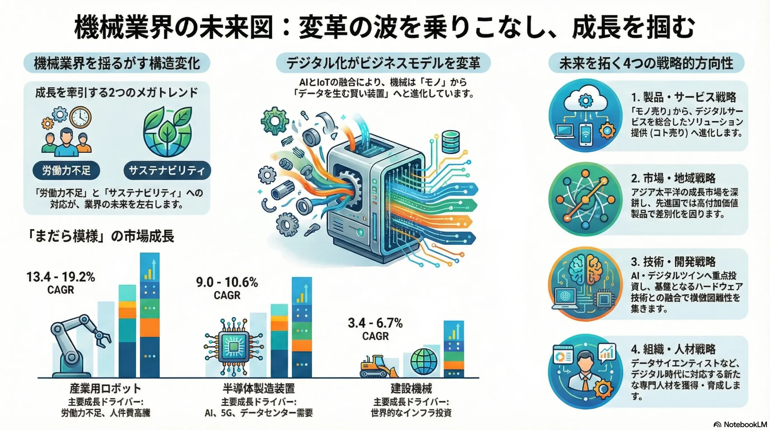 本レポートは、機械業界が直面する構造的な変革期において、持続的な成長を達成するための事業戦略策定に向けた包括的な分析と戦略的提言を提供する。世界経済の緩やかな成長が常態化する中、機械業界は従来の量的拡大モデルから、高付加価値化と効率化を追求する質的転換の局面に移行している。この変革を駆動する二大潮流は、「世界的な労働力不足」と「サステナビリティへの要請」であり、これらに対応する核心的な解決策として「デジタル化」と「サービス化」が不可欠となっている。